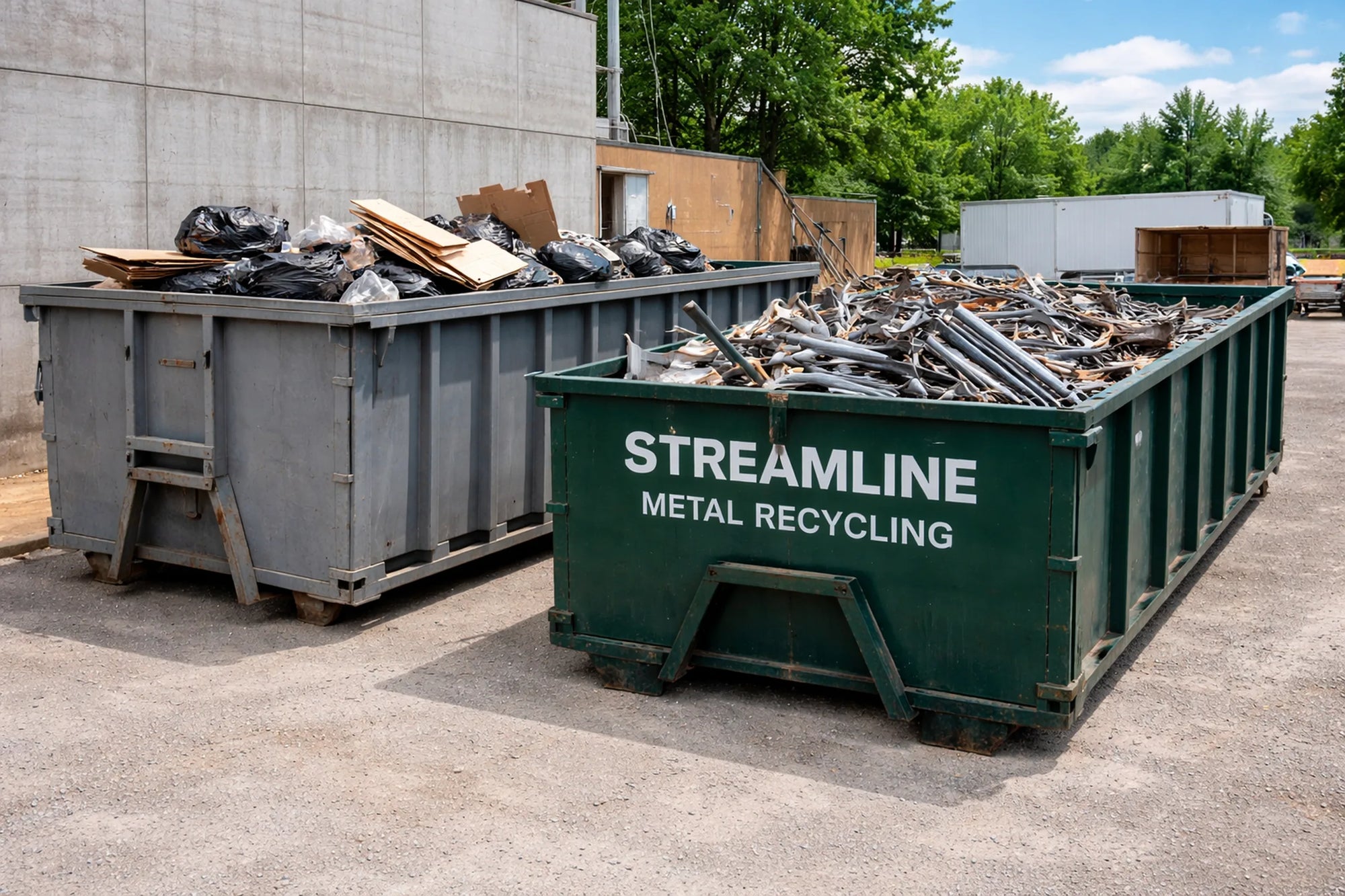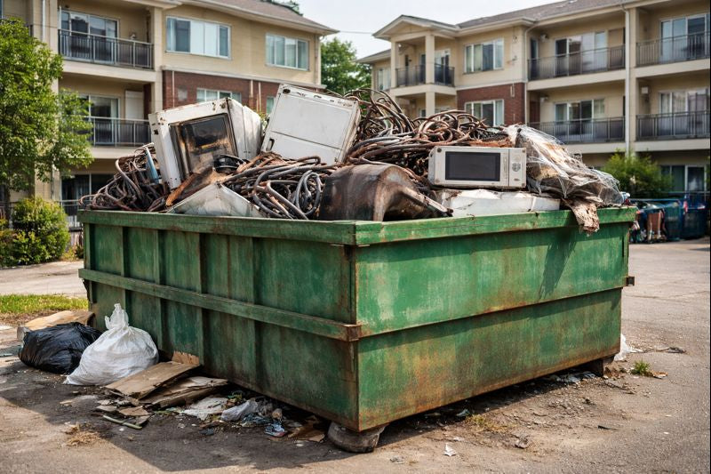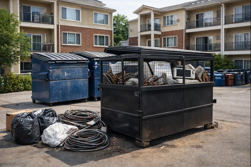 Appliances and maintenance scrap often go into trash dumpsters, increasing weight, pulls, and costs. Property managers face higher waste bills when metal is mixed with regular trash.